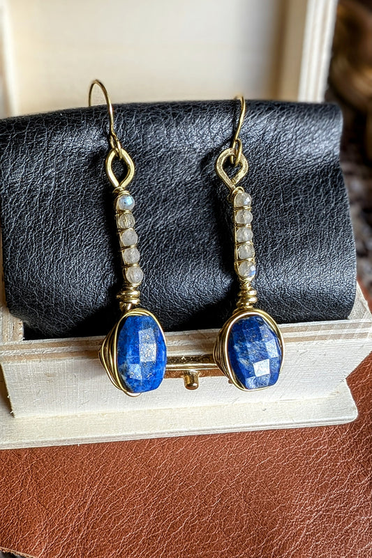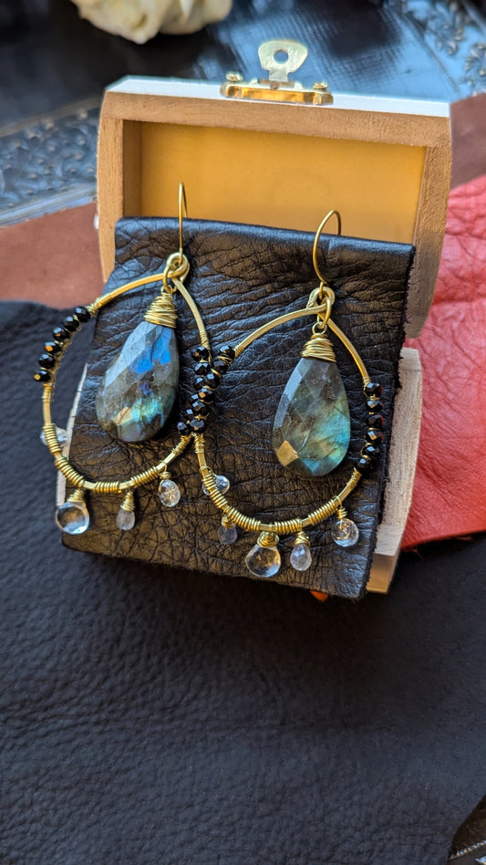 Handcrafted Brass Earrings with Black Spinel, Labradorite, and Clear Quartz"