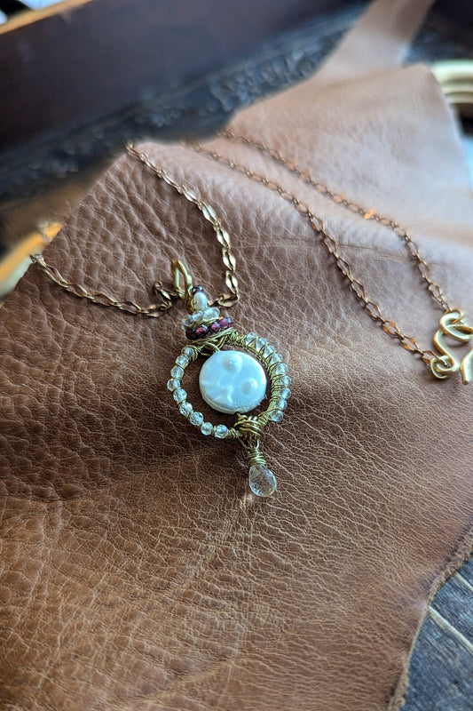 Handcrafted Rich Low Brass Pendant with Clear Quartz, Garnet, Topaz, and Pearl