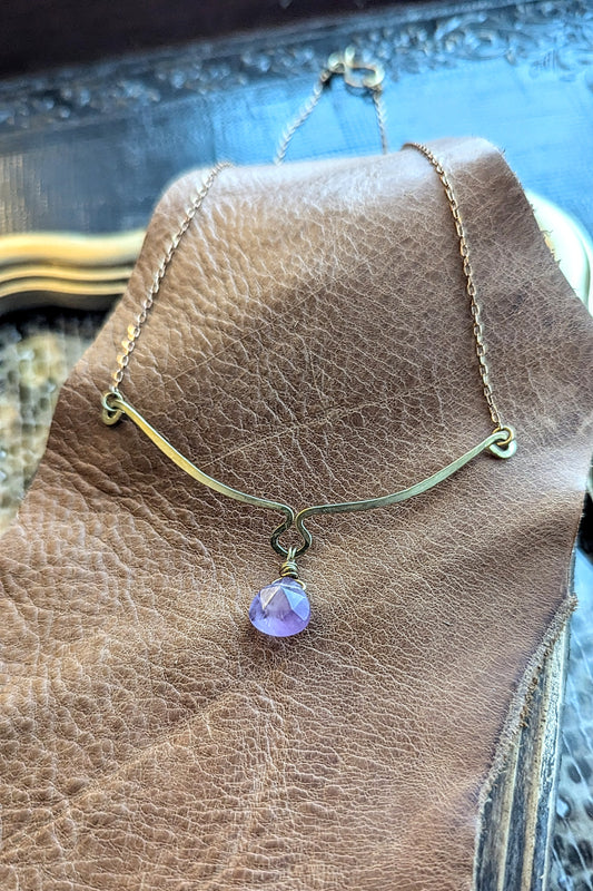 Handcrafted Rich Low Brass Necklace with Hammered Bar and Amethyst Drop