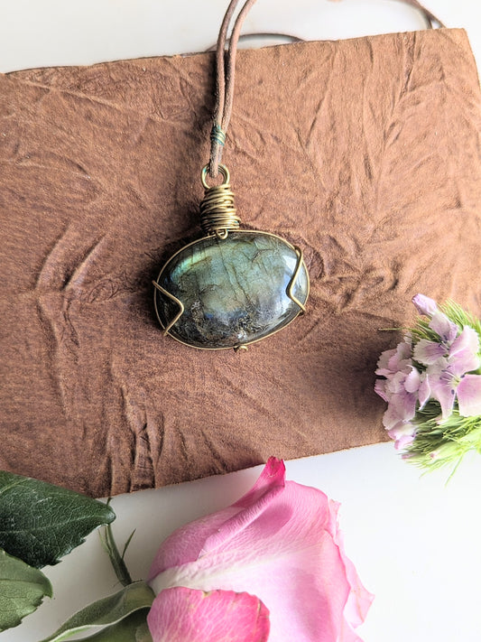 Labradorite Cabachon Brass Wire Wrapped Patina Distressed Leather Cord Pendant