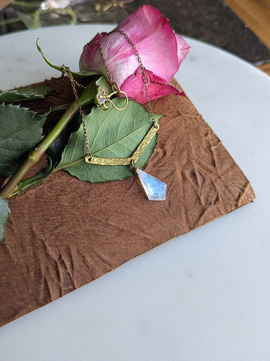 Faceted Moonstone Pendant on Hammered Rich Low Brass Bar Necklace