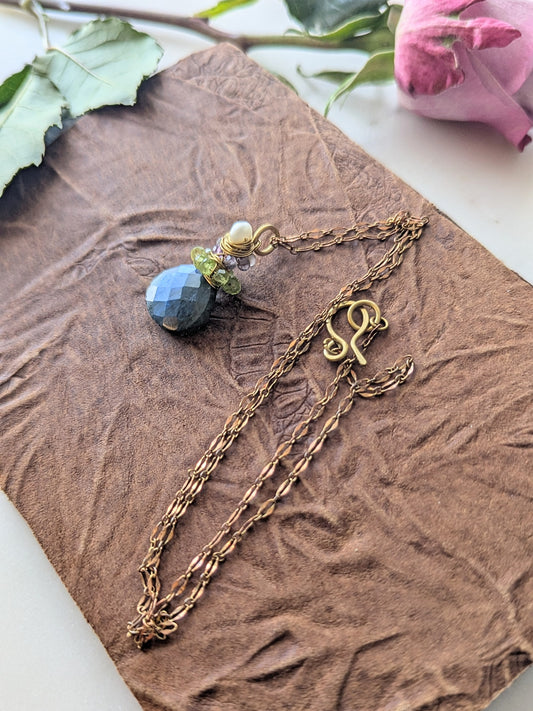 Labradorite & Gemstone Crowned Pendant on 20” Rich Low Brass Chain
