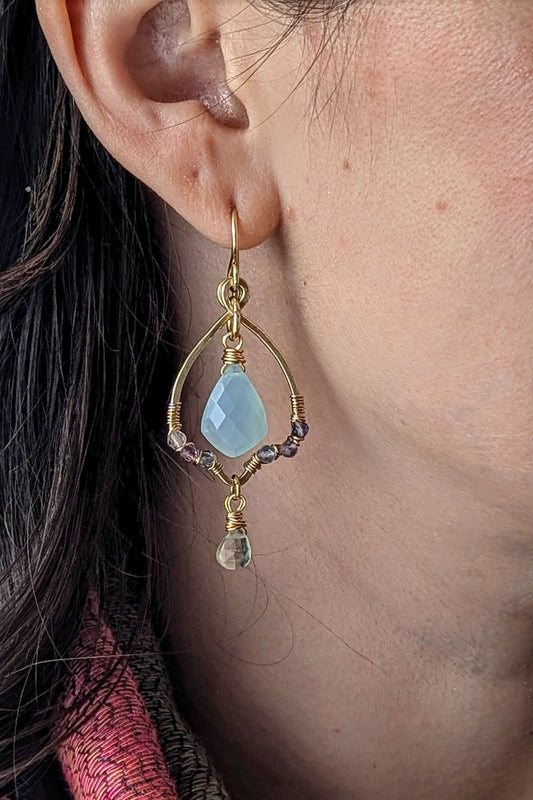 Handcrafted Brass Necklace and Earrings Set with Aqua Blue Chalcedony, Fluorite, and Prehnite