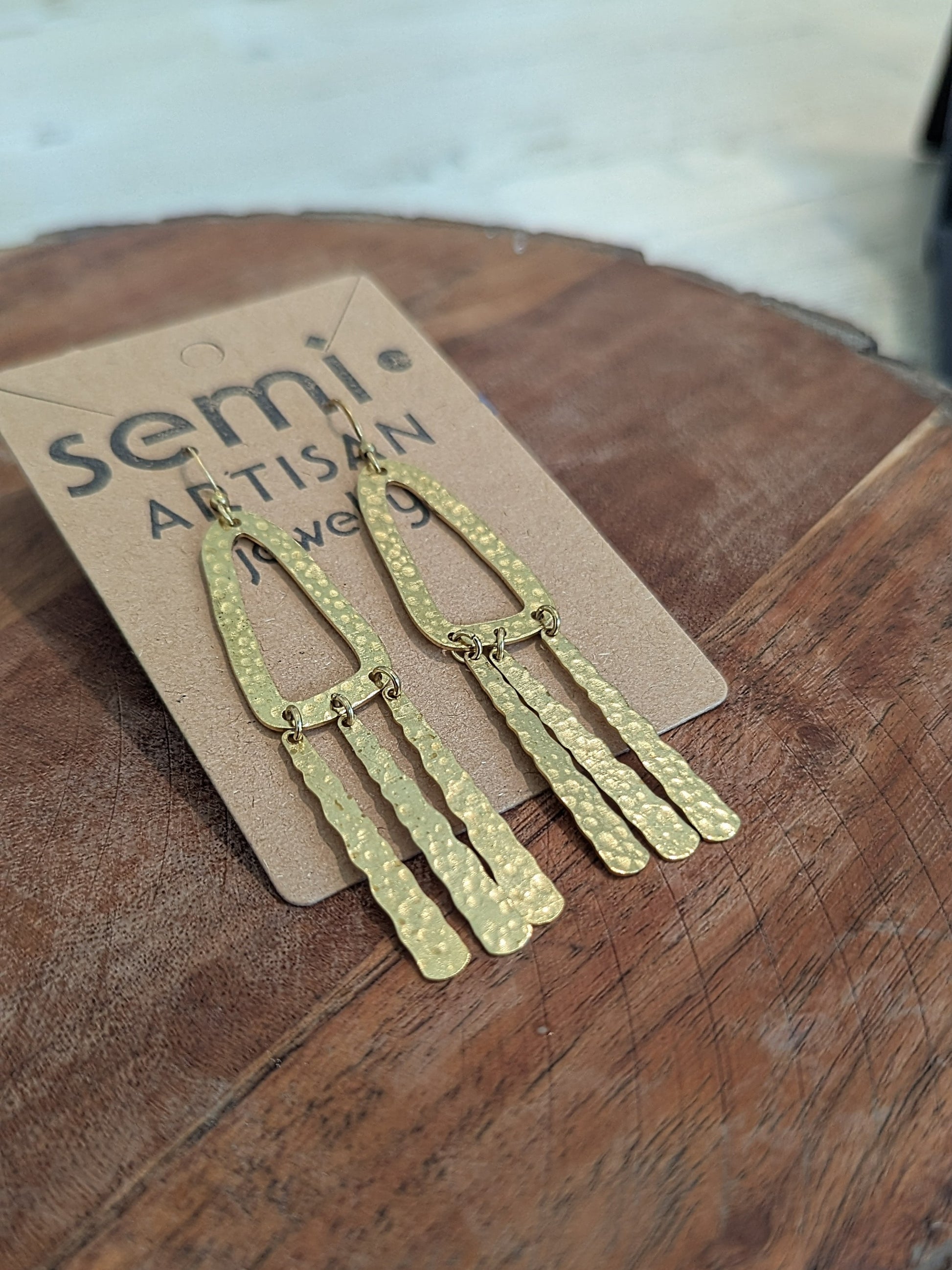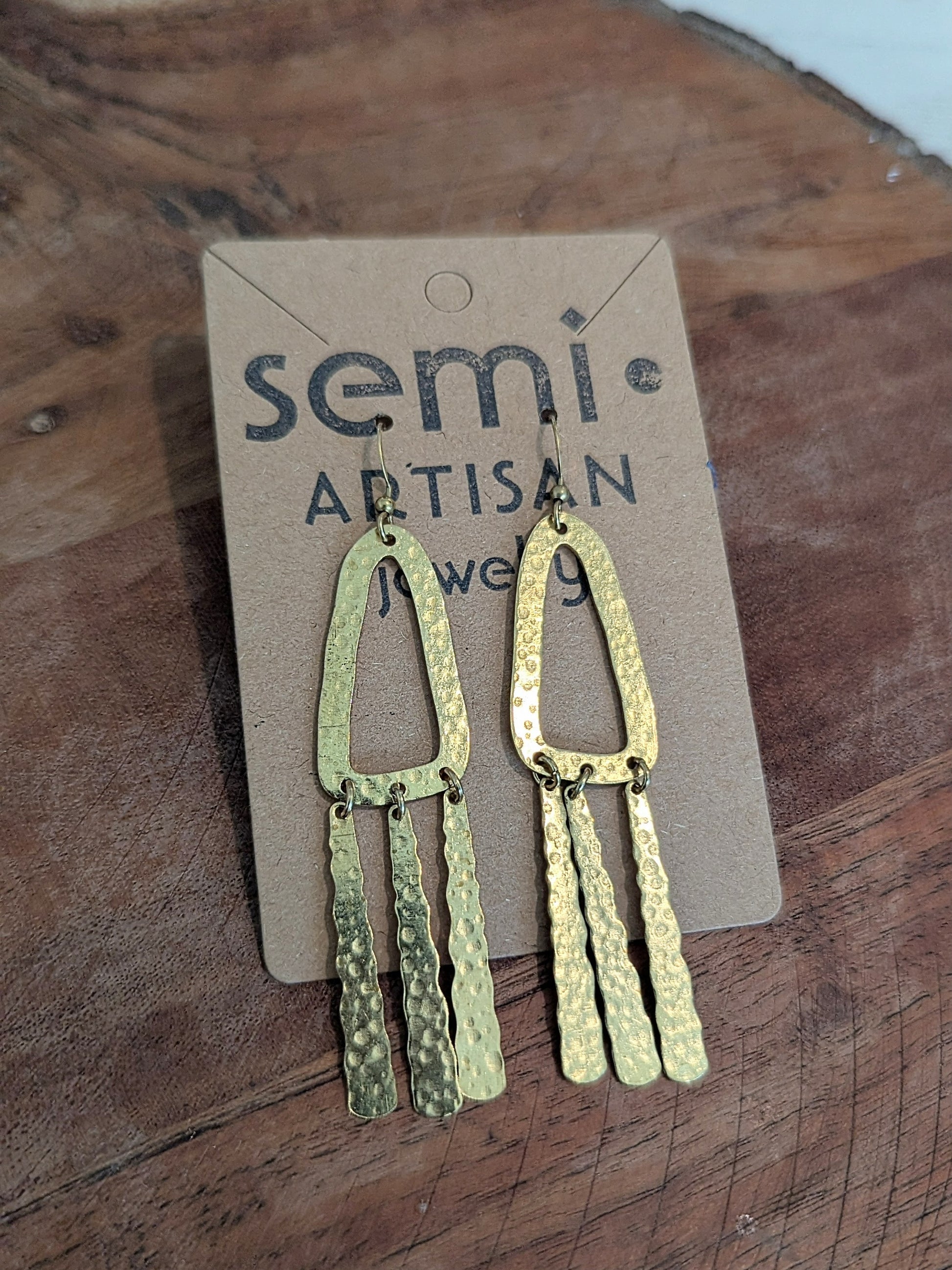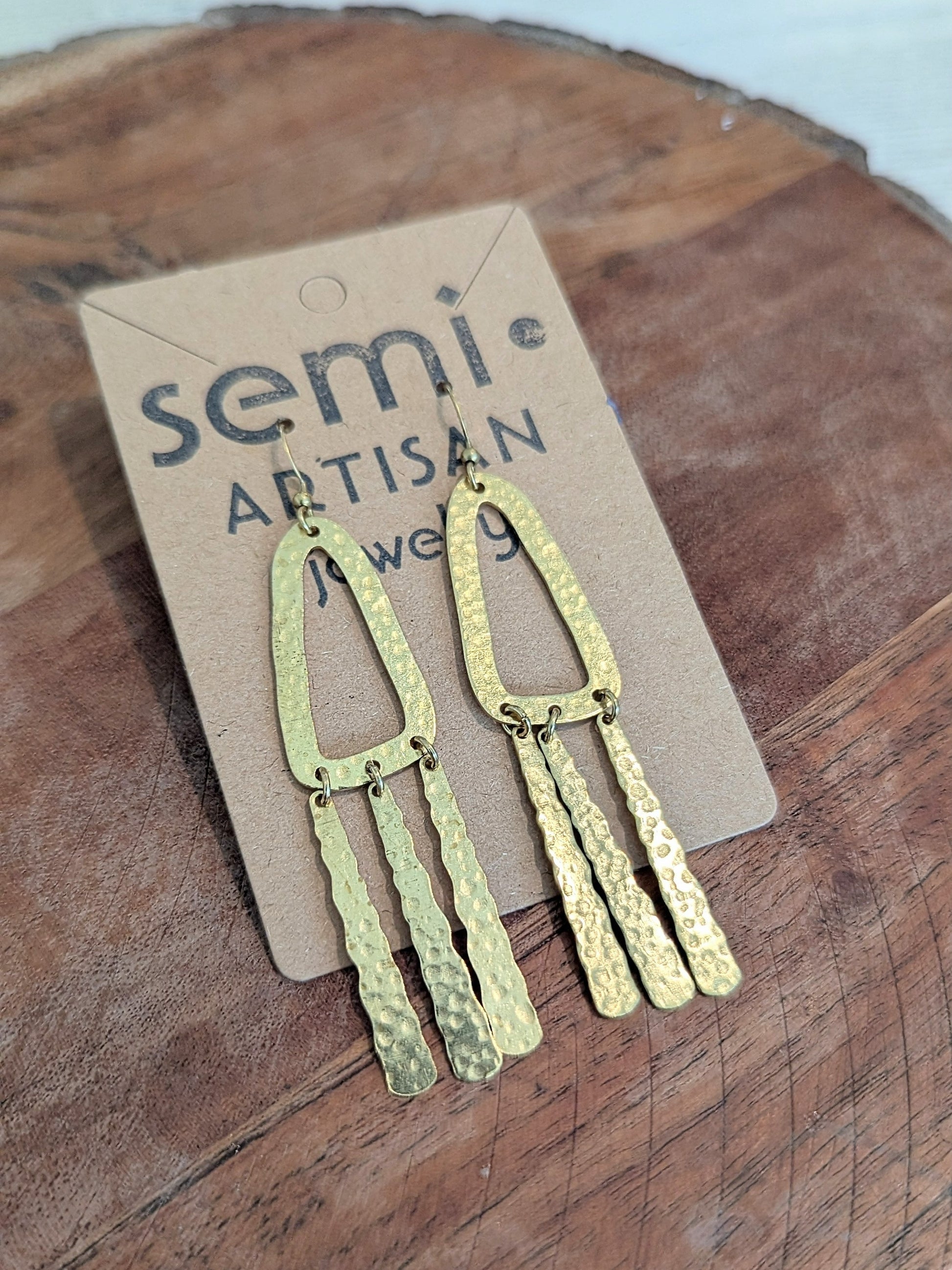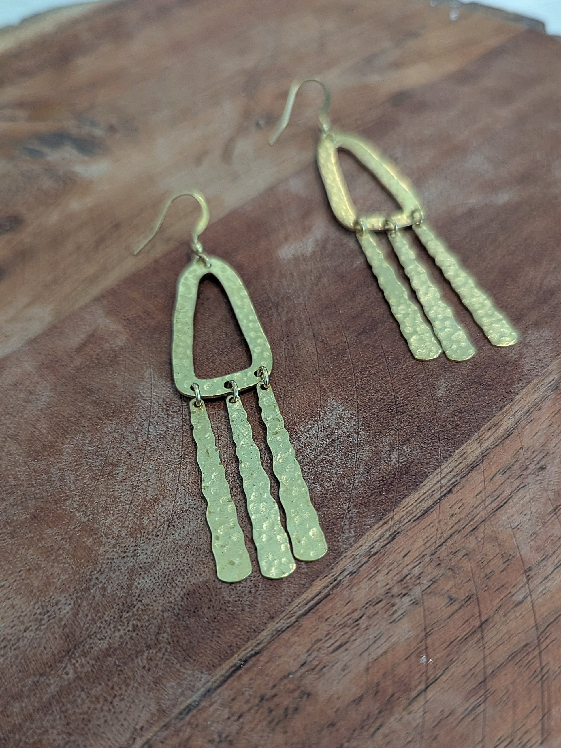 The Cascade Trail Earrings capture the beauty of flow and form. Three hand-hammered brass drops create a sleek, tiered fringe that moves gracefully with every step. Lightweight yet bold, these earrings are designed for those who love modern minimalism with a handcrafted edge.